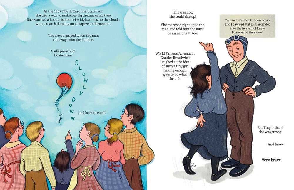 Just when you think you’ve read the all coolest biographies of female innovators, Candy Dahl and Maithili Joshi prove you wrong. In 1893, Georgia Ann Thompson was born, weighing only 3 pounds, but her impact is still felt today. Nicknamed “Tiny” because of her diminutive size, she set out to climb up: up tobacco leaves and cotton mill machinery in her childhood jobs; up trees as she dreamed of getting away from tobacco fields and cotton mills; and up, up, up into the air as an aeronaut, after seeing Charles Broadwick rise up in a hot-air balloon and parachute to the earth. Tiny learned from Broadwick and became famous, touring the country and performing daring feats. Pushing the envelope, she became the first woman to parachute from an airplane and created the parachute ripcord when one of her jumps encountered problems. Dahl uses quotes from Broadwick to allow readers to step into her shoes and experience the excitement and the bumps and bruises of the aerialist: “I had broken bones an dislocated shoulders… I loved it. I loved the excitement” and how women were treated at the time: “It burned me up having to dress like a baby doll and having that name tacked on me!” An author’s note provides further detail on Tiny’s life; a bibliography provides more resources for further reading. The State Archives of North Carolina provides a lesson plan on Broadwick and publisher Little Bee offers downloadable activity sheets on their webpage. A good addition to picture book biographies!